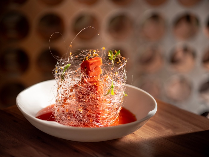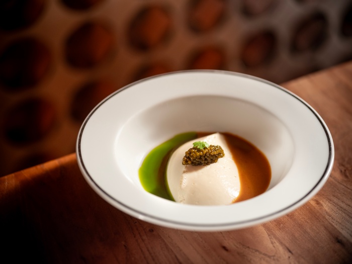 手工研磨的豆腐经细致处理,口感细腻如凝脂;而顶部点缀的鱼子酱,更添入咸鲜脆感,与豆腐的软嫩相得益彰。令食客尝之既解秋燥,又被这份层次丰富的滋味打动,满心愉悦。
