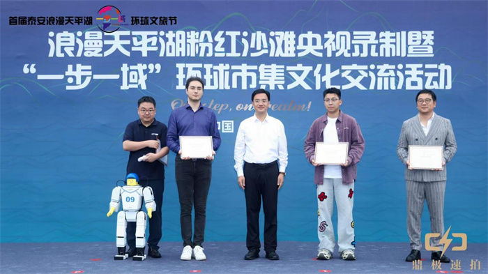 活动前期筹备与预热环节紧密衔接,9月27日,首届泰安浪漫天平湖“一步一域”环球文旅节启幕仪式隆重举行。泰安市副市长唐传营、泰安旅游经济开发区党工委书记朱英文、泰安旅发集团董事长罗士贞、泰安旅发集团总经理苗伟、“一步一域”项目创始人赵俊等出席此次启幕仪式,突尼斯驻华大使阿迪勒·阿拉比、罗马尼亚驻华公使克劳迪·弗洛瑞安、突尼斯国家旅游局首席代表阿诺尔·柴托等国家驻华代表受邀至安泰山天平湖亲临开幕式现场;中外文艺界人士也精彩助力,突尼斯男高音歌唱家Hassen Doss与比利时籍网红达人小GeoGeo、山东籍小演员Tammy甜蜜蜜献唱经典法语曲目,用悠扬歌声唱出中外友谊之声,来自中国的网络歌手棉子、时尚集团副总裁余辉、中粮旗下凯莱集团总经理薛鹏程等知名人士齐聚一堂,共同见证文旅节的启幕,为活动注入浓厚的国际交流氛围与艺术活力。同日,副市长唐传营向“一步一域”合作伙伴代表亚洲青年艺术家提名展、鹿鸣机器人、突尼斯展售商等颁发优秀合作伙伴荣誉为10月1日至10月8日开幕的“一步一域”环球市集造势升温。