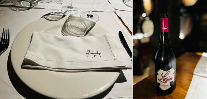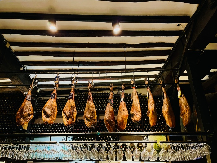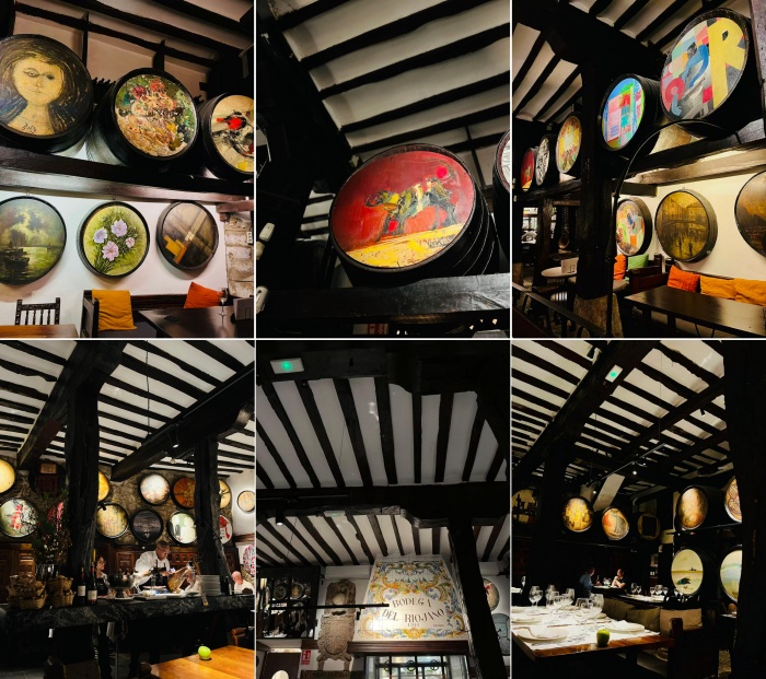 餐厅保留了酒窖的原始骨架,墙壁上满是葡萄酒桶,色彩浓烈的图案里藏着里奥哈地区的酿酒故事;吧台上,悬挂的伊比利亚火腿泛着诱人的光泽,空气中飘着酒香与橄榄油的醇厚。