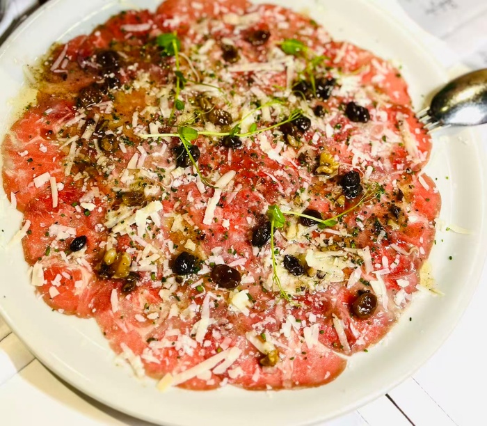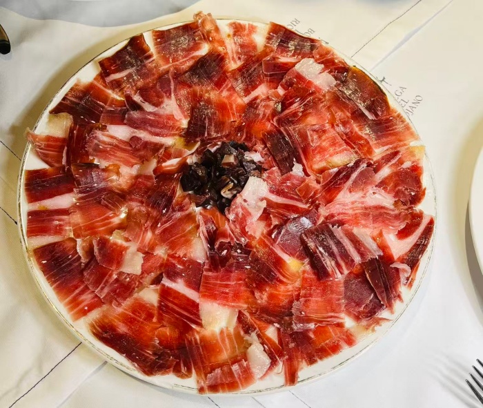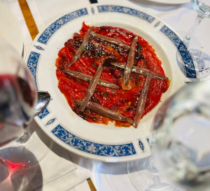 餐前面包配橄榄油是不变的开场,全麦面包蘸上金黄的初榨橄榄油,简单却充满麦香的本味,瞬间唤醒味蕾。头盘的伊比利亚火腿片非常受欢迎,薄薄的肉片入口,咸香中带着橡果的坚果气息,便知是顶级食材的味道;薄切生牛肉片上铺着些许Cheese与葡萄干,咸香与微甜在口腔里碰撞;腌凤尾鱼与腌甜椒的搭配更是妙笔生花,甜椒的清爽完美中和了鱼的咸度,解腻又开胃。