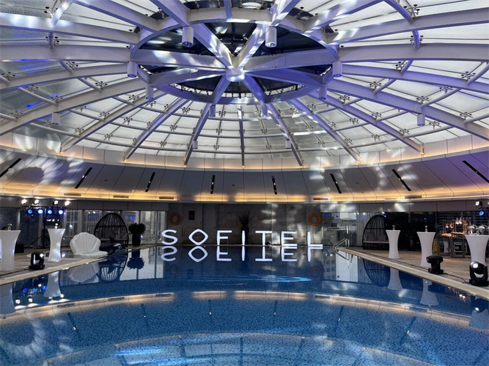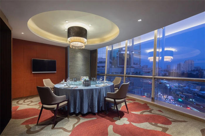 钻石厅可容纳近500人同时用餐,层高七米,全厅无柱,钻石灯、吊顶及柔和细腻的灯光将法式优雅演绎到极致。水晶厅为16桌以内的精致型宴会提供了私密空间,弧形全景落地窗增添更加多彩的城市景观。