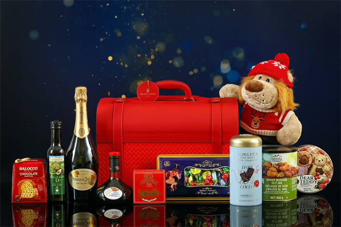 豪华圣诞礼篮包含:经典丽思红色礼篮、法国巴黎之花美丽时光香槟、酒店小狮子-中号、美国赛欧蜂蜜混合坚果、莫奈瑞铂金标巴萨米醋、爷爷农场牛油果油、泰迪熊饼干、爱普生巧克力、圣诞意大利潘娜托尼面包、特威圣诞礼茶、莎莎的店经典太妃糖等精选品牌礼品。