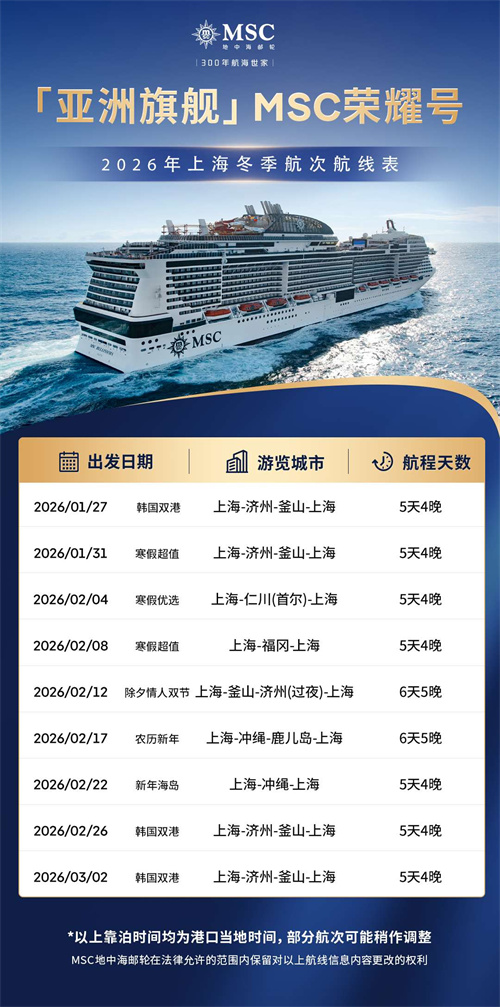 · 海上过春节,儿童免船票:此次回归的MSC荣耀号将执航三个春节航次,涵盖2月12日除夕夜、正春节2月17日及2月22日出发的4晚及5晚航次。值得一提的是,第三四人儿童免船票将首次涵盖春节旺季出发的2月12日及22日两个航次。爆款稀缺春节航次首次以限时超值优惠献礼中国宾客,邀请全家在海上过春节。