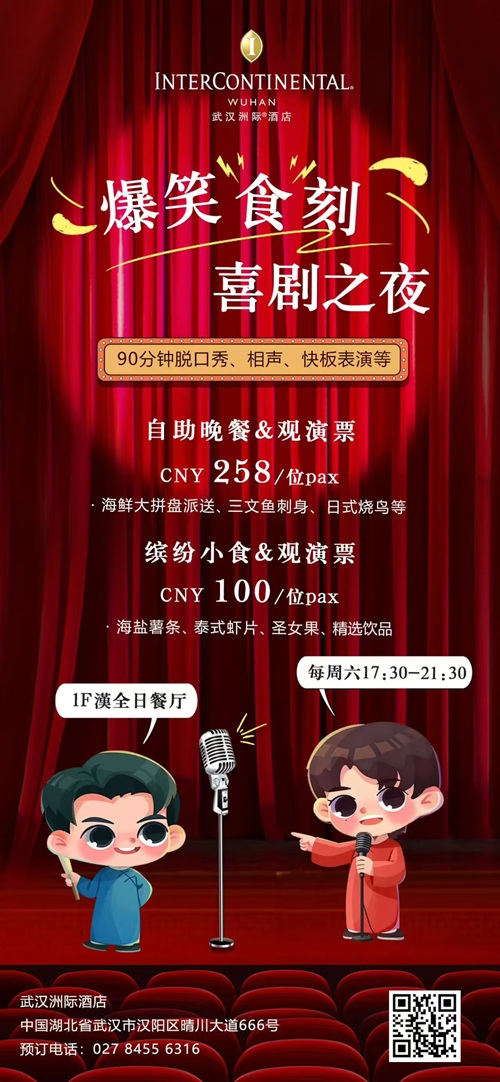 【爆笑“食”刻喜剧之夜】即将欢乐启幕!自本周起,每周六晚,在武汉洲际酒店漢全日餐厅的自助晚餐时段,我们将为您奉上一场笑声不断的视听盛宴。武汉洲际酒店携手扎根武汉的本土喜剧社团——嘻哈壹笑堂,将地道汉味喜剧搬上餐厅舞台。无论是脱口秀的妙语连珠、漫才的诙谐互动,还是情景喜剧的生动演绎,内容都深深植根于武汉的本土文化与日常生活,幽默俏皮,汉味十足。