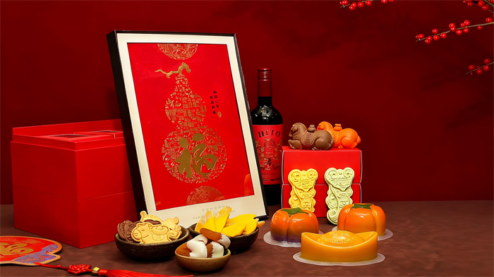 云阙珍礼,臻选荟萃。“云阙珍礼”新春礼盒则是更为丰盛的不二之选。它不仅包含了“锦韵糕升”年糕礼盒中的所有年糕单品,更扩展了美味版图。糖醇黑芝麻馅及糖醇南瓜馅的如意形糕点,既有象征吉祥如愿的如意外形,又能满足食客们健康饮食的偏好;搭配新年“马上有福”巧克力、香草曲奇饼干,以及风干杏干与芒果干沾巧克力,口感层次丰富,能满足全家老少的不同喜好。同样,一瓶寅佳赤霞珠红葡萄酒的加入,使得这份礼篮无论是作为致赠亲朋的体面好礼,还是家庭欢聚的甜蜜点缀,都尽显周全与诚意。