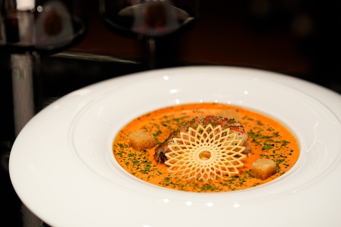 套餐自经典餐前布里欧修黄油面包配风味蘸酱温馨启程。前菜鹅肝爱心慕斯匠心独具,将丰腴鹅肝化作甜蜜爱形,佐以波特甜酒冻与跃动芒果爆珠,寓意爱意真挚,惊喜跃然舌尖。随后的蒜香大虾配蟹肉番茄浓汤,则以馥郁鲜香,娓娓道来温暖情愫。