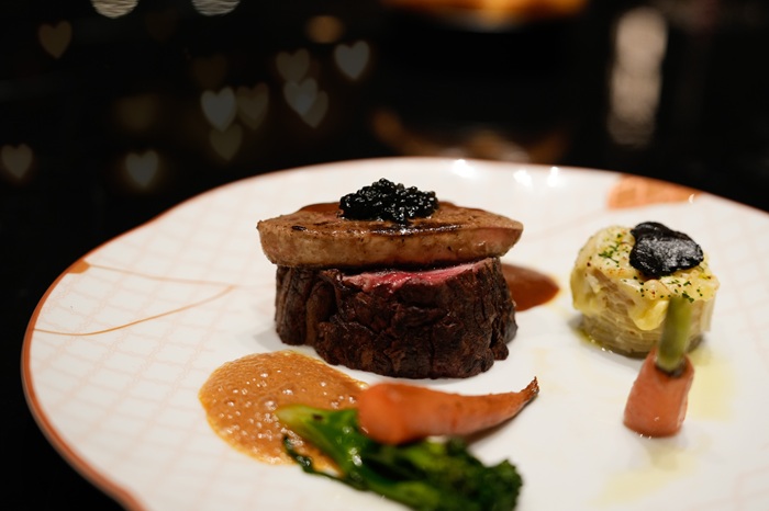 主菜法式罗西尼和牛牛柳是当晚的味蕾高光。精选优质和牛牛柳,搭配香煎露杰鹅肝、黑鱼子酱,淋上香气深邃的松露红酒汁,多重顶级风味交织成一道奢华而平衡的奢享盛宴,诠释爱情丰盈珍贵的本质。