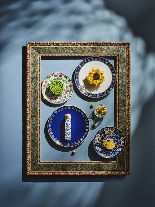 上海浦东丽思卡尔顿酒店的厨师团队深入探寻展览中蕴含的东方美学密码与风味哲学,从繁复华丽的纹饰、浓郁鲜明的色彩与独具风情的食材中汲取灵感,将几何藤蔓、花卉纹样与异域香料,巧妙转化为一系列精美甜点与咸点,于方寸餐盘间演绎图案的叙事与味觉的层次。