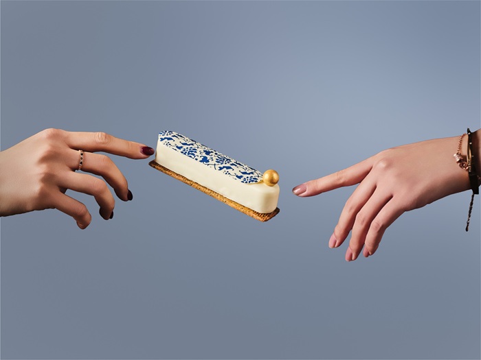 灵感源于萨法维王朝的稀世笔盒。左侧镂空网格复刻笔盒雕花,右侧蓝白纹样呼应古典珐琅,顶部点缀金球。杏子的清甜、百香果的微酸与醇香奶茶慕斯交织,呈现兼具艺术感与风味的甜点。