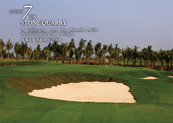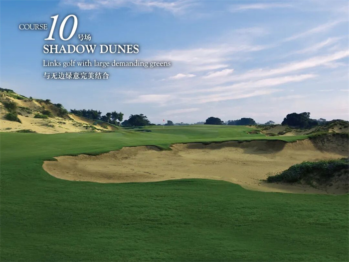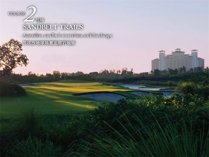 将人们带入“沙的世界”,这块球场以高大的沙丘和海南岛广阔的海滩上所能找到的当地植被为景观,呈现出富有特色的环境条件。不过,它并不是一块沙滩球场,而是以波浪起伏的造型和度假区中最大的果岭为特色。这些狂野的果岭造型,可能会造成一些令人恐怖的长距离推杆,但是,它又并不是一座能够简单以距离征服的球场。球手在果岭上短距离推杆的精确性同样重要。作为一个大约仅有6600码、标准杆为70的球场,这里发球台和果岭间的密切连接非常有利于人们在其中的行走,也大大降低了打球所需的时间。