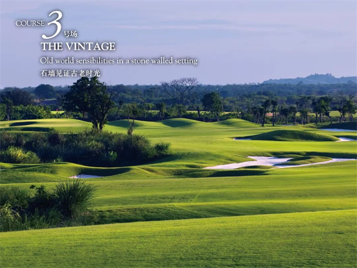 这18个3杆洞组成的球场集合了独特而清晰的风格特点,每个果岭设有两个洞杯。这样的果岭设计是为了提供两种选择:一个更简单、位置更容易估计,另一个则要困难得多。植物园式的园林风格给人一种很享受的布满各色树木和鲜花的氛围环境,与海口的蓝天和清新空气相得益彰。所有水平级别的球手都可以在这座球场找到适合他们的心情和技术的乐趣。家庭成员、初学者以及职业球手,都能够在此打球或练习,度过愉快美好的一天。