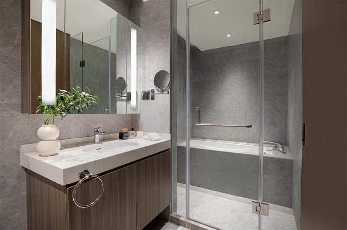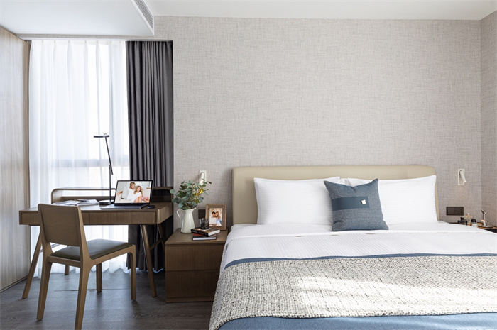 上海盛捷徐汇滨江界服务公寓拥有223套精致客房,从单房公寓到三房套房,设计风格现代简约又不失柔和典雅的质感,以木纹与暖灰色调为基底,盛捷将“现代简约”与“居住功能”完美融合,每一套公寓都像一个精心打磨的艺术空间。