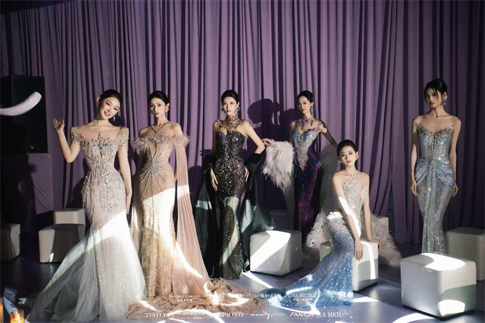 秀场环节,模特身着夺目礼服,在璀璨光影中优雅登场,将现场氛围推向高潮。随后,皇后婚礼策划团队登台分享,深度解读品牌服务理念,剖析前沿婚礼流行趋势,并针对主题定制等核心环节,为准新人提供了专业的策划思路。