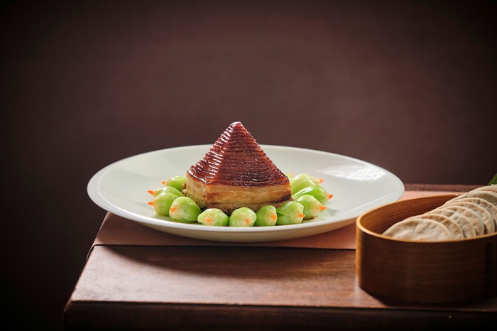 金牌扣肉即“东坡肉”,是为了纪念在宋时任杭州市长的苏东坡而创,已有九百余年历史。在考虑到原有菜式容易让客人有肥腻感,湖滨28中餐厅的主厨将其改良成薄如蝉翼的19层"宝塔肉”,配以笋干、小青菜,一同夹进当季的栗子饼中,猪肉油而不腻,酥而不软,为京城食客带来这道独特的“东坡肉”。