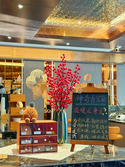 大堂一隅的“百宝箱”,更是这种温度的延续:牙线、卸妆湿巾、眼罩……那些你或许忘记携带、却可能急需的小物品,都被细心收纳,静待取用。