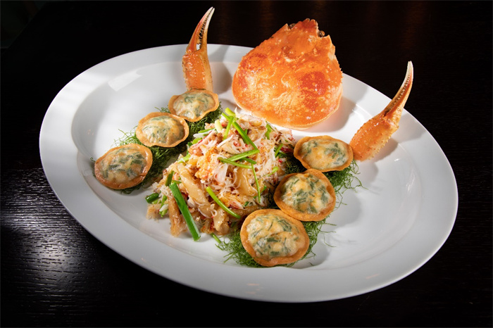 一蟹双味,尽显秋日丰腴。老菜脯蟹肉炒花胶以十年老菜脯搭配花胶,猛火快炒间,菜脯的咸香、花胶的软糯与蟹肉的鲜甜交织,略带微辣,潮式韵味十足。沙葱蟹盒将沙葱、蟹肉、虾饺与笋粒包裹于春卷皮中,炸至金黄酥脆。一口咬下,外皮松化,内馅丰盈多汁,沙葱的辛香更衬出蟹肉之鲜,层次分明。