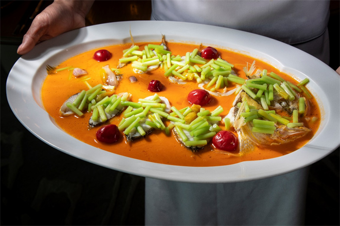 选用肉质细腻的闽东黄鱼,以酸辣红泡椒与醋椒汁一同烧制。热气蒸腾间,酸香扑鼻,辣意隐约,激发鱼肉的鲜活底蕴。