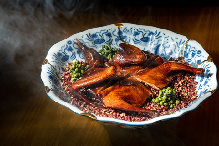乳鸽以秘制沙姜粉、盐焗鸡粉入味,辅以生抽、老抽与泸州老窖酒精心腌制,经自然风干后,再以苹果木熏烤赋予独特烟香。鸽肉酱香浓郁,肉质紧实,萦绕着果木与花椒的复合香气,回味悠长。
