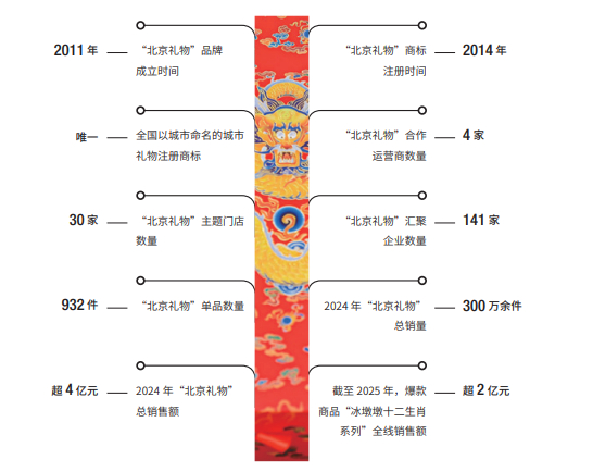 “北京礼物”作为全国首个且唯一以城市命名的城市礼物注册商标,2011年创建、2014年完成商标注册,始终以“传播中华优秀传统文化、传承首都历史文脉、讲述北京故事、展现时代风貌”为根本使命,在北京市文化和旅游局统筹指导下,历经“1.0阶段(基础供给)—2.0阶段(品牌提升)—3.0阶段(创新发展)”三阶段,逐步实现从解决旅游商品供给到提升品牌品质、再到打造沉浸式文化消费载体的跨越式发展。截至2025年10月,“北京礼物”已汇聚141家优质合作企业,开发非遗老字号、美妆时尚、科技创意、红色主题、纪念衍生品、特色美食等品类932件特色商品,在全市布局30家主题门店;2024年全品类销售额突破4亿元,其中“冰墩墩十二生肖系列”爆款商品销售额超2亿元,成为彰显首都文化魅力、激活文旅消费活力的核心品牌载体。