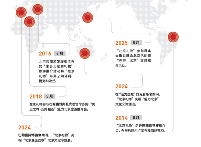参与国际重大活动。“北京礼物”作为文化使者,多次走出国门亮相国际舞台。从2014年走进巴西世界杯推介会,到2016年亮相中东欧三国,再到2024年现身巴黎国际博览会、“活力悉尼”灯光音乐节,及2025年参与日本大阪世博会,其以独特文化内涵成为连接中外的纽带,让中国品牌与首都风情走向世界,促进文明交流互鉴。