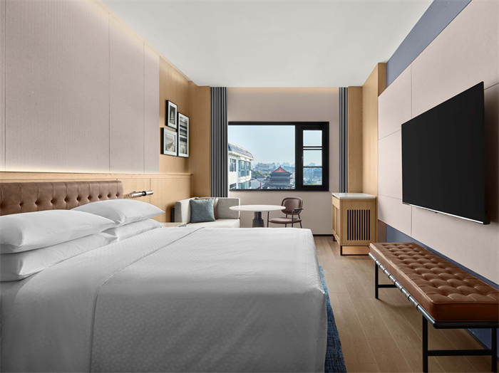 新酒店的设计延续品牌标志性的摩登经典风格,并融入丰富的在地文化元素。大堂内悬吊式艺术装置汲取中式古建筑的结构之美,致敬古都的千年风华。中庭花园以东方极简之美营造静谧意境。酒店拥有214间客房及套房,摩登经典设计搭配温暖中性色调,营造轻松舒适的居停氛围,均配备舒适床品、65英寸液晶电视、独立淋浴间以及免费高速无线网络等现代化设施,满足当代宾客的多元需求。此外,入住景观房还可观览西安地标建筑“钟鼓楼”的魅力风光。