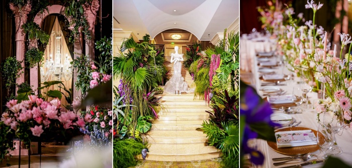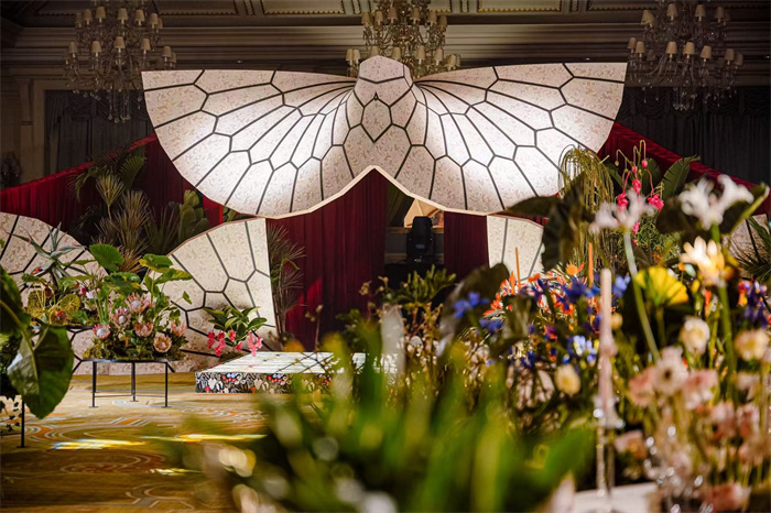 本次婚礼秀的创意以“主角”视角展开,强调婚礼不仅是一段爱情的呈现,更是两条人生轨迹在此刻交汇、共同完成“剧本合幕”的重要篇章。秀场分为“男主”与“女主”两条动线:男主从结构感强烈、光影深邃的哥特式拱顶灵感空间步入,象征成熟、坚毅与责任;女主从充满生机与浪漫的花园式入口亮相,象征温柔、绽放与希望。两种截然不同的场景语言在宴会厅中交汇,寓意新人携手走向共同未来。