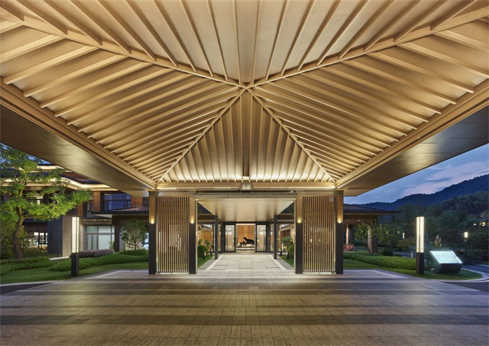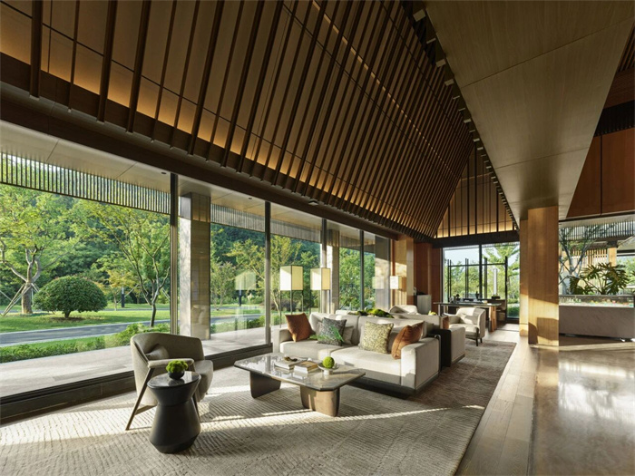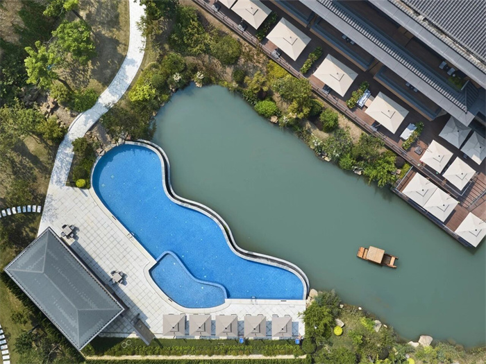 今天的主角——宜兴西岸凰川酒店,就隐逸于宜兴丁蜀镇的大凰川千亩原始山谷之中,沿湖错落而立,收尽山峦溪谷、茶洲竹海、泻湖水系之灵韵,为远道而来的旅人们绘就出一幅可游可居的现代江南“富春山居图”。