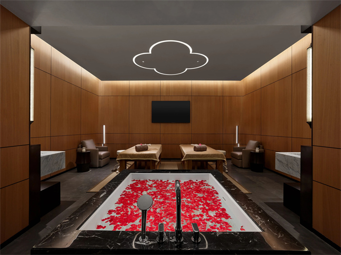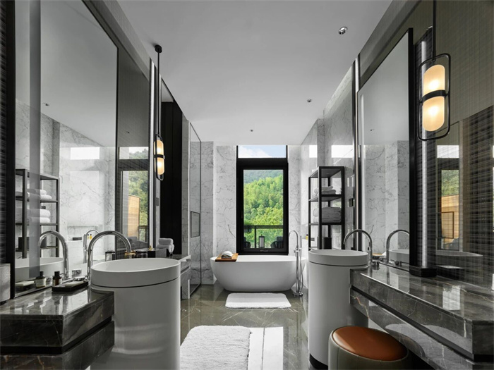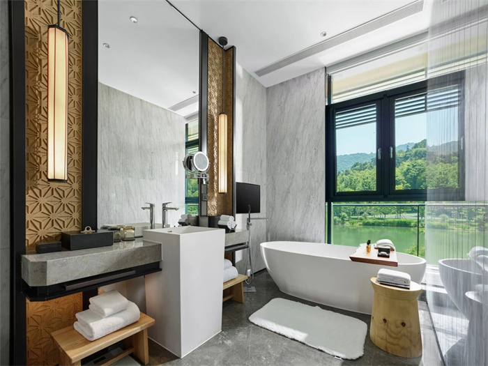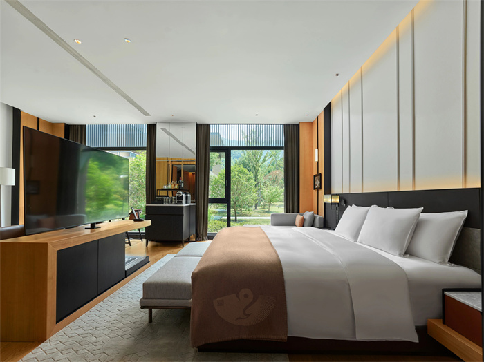 所有客房休憩、起居、办公等功能区完善,干、湿分离浴室内配有步入式雨淋花洒及浴缸。同时,房间内还配备三星QLED电视机、BALMUDA床头音响、Nespresso咖啡机、戴森吹风机、Le Labo或DIPTYQUE备品选择,以及“妙梦”助眠睡枕,启晨、入夜,都能让你尽享鸟语或清风相伴的仪式感。