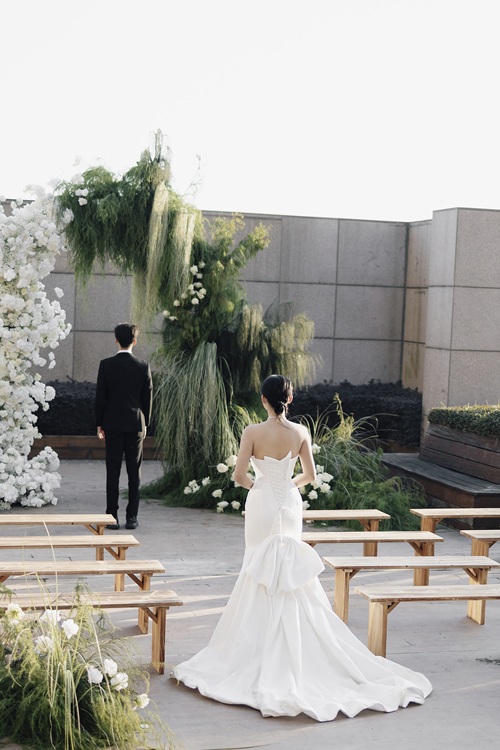 此次婚礼秀全新推出的3楼户外仪式区,无疑是当天的焦点所在。该区域以“暮光之城”为设计灵感,通过镂空花艺拱门与光影的巧妙结合,让自然光线在空间中交织流动,营造出梦幻般的浪漫氛,打造一场充满自然气息的户外婚礼。