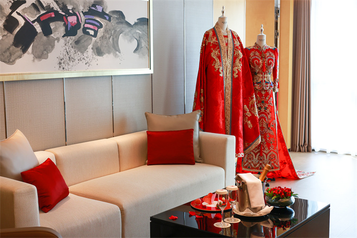 本次婚礼秀,上海宝华万豪酒店向嘉宾展示了其独具特色的婚礼场地:层高达10米的百宴厅以其大气恢弘的空间,宜中宜西的布置风格,为婚礼搭建提供了无限可能;另一处层高7米的宴会厅则营造出私密温馨的氛围;还有拥有270°全景落地窗的婚礼套房,将城市公园的四季美景尽收眼底。