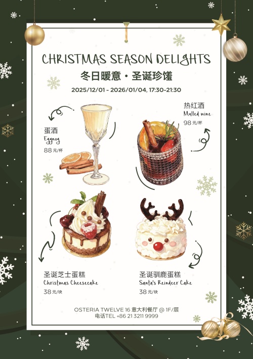 从黄昏到夜色渐深,香料萦绕的热红酒、绵滑浓郁的蛋酒,与圣诞限定蛋糕一同构成冬季最柔软的味觉记忆。无论是独自放松,或与好友小聚,这段“冬日序曲”都将在 Osteria Twelve 16 缓缓展开。
