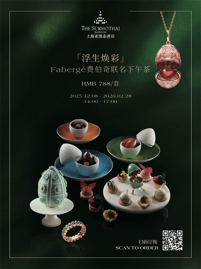 上海素凯泰酒店携手传奇珠宝品牌Fabergé,重磅呈现“浮生焕彩”联名下午茶。本次跨界盛宴以 Fabergé 标志性蛋形珠宝设计为灵感,将皇室典雅风范与百年匠心技艺巧妙融合,为宾客雕琢一场兼具尊贵仪式感的味蕾之旅。此次联名下午茶限定供应至2026年2月28日,凡到店品鉴的宾客,可尊享品牌专属定制精美伴手礼一份,让奢华体验延续回甘。