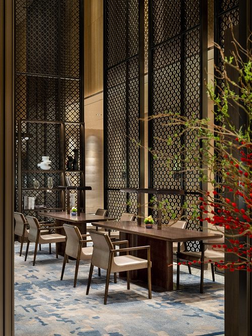 客人通过大堂进入酒店,立即被奢华的氛围环绕。面前的走廊地面铺设的大理石光滑如镜,顶部照明设施精美绝伦。穿过走廊,客人仿佛踏入一方露天庭院。“大堂天花板采用三角形图案设计,将光线和阴影投射到大堂空间。我们试图用几何形状来诠释高度和空间的交错感。”Andy Long介绍说:“大堂两侧布置了中国传统屏风,灵感来自长沙当地著名的标志性建筑——岳麓书院。这些统一风格的布置营造出一种身临其境的感觉,使客人仿佛置身于当地风格的建筑中。”