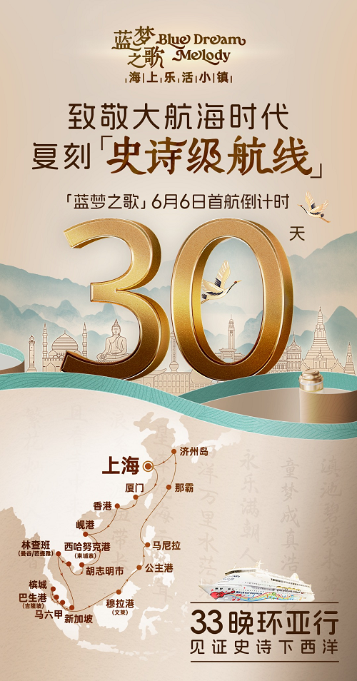 “蓝梦之歌”号首航倒计时30天之际官宣33晚环亚超长航线