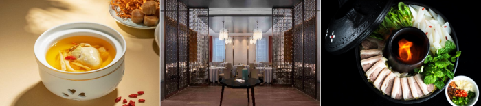 海口威斯汀酒店中国元素中餐厅的儋州沙虫生蚝汤、中国元素中餐厅、西安浐灞艾美酒店乐美中餐厅的云南炊锅糊辣黑山羊