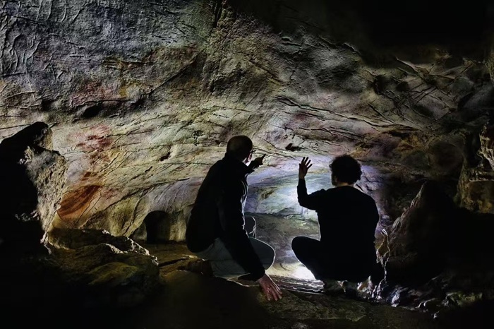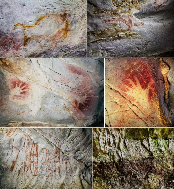 洞窟内的考古层位记录了,约3万年前,尼安德特人和智人两种人类曾在此共存。洞内岩石上正在回望的野牛、灵动的山羊、奔跑的马、野鹿等。惊叹当时的人类,已经懂得如何用艺术的手段来表达,他们先是在岩石上刻出动物的形状,再将矿石颜料通过骨头制的管子吹喷到线条表面;出现的手印应该有两种情况,将有涂料的手支撑着石块留下的,另外白手印应该是将手覆盖在头顶上的岩石,再吹上颜料;还有一些黑色的岩画属于中间时期,红与黑两种色彩有着鲜明的对比。