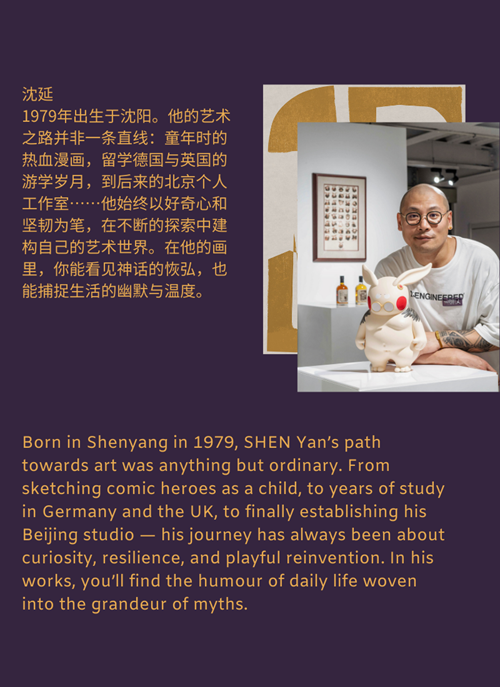 沈延(1979年生于沈阳),先后在德国和英国学习艺术,2014年起在北京设立工作室。他的创作特点在于以水墨与绢本为基础,融合当代语言与自由构图,将传统审美与现代情感相结合。其作品往往使宏大叙事与个体生命体验并置,既有文化的厚度,也映照日常的人性与幽默。