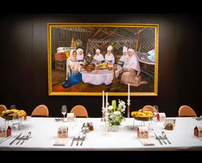 餐厅内部空间兼具餐饮与博物馆功能。墙壁上悬挂的“百幅油画”勾勒出哈萨克斯坦的历史长卷,既能唤醒民族记忆,又构建出当代餐饮美学空间。配合艺术陈列,厅内展示着原生态的民族展品、传统手工艺品及民族装饰艺术元素。这些展品既提升美学体验,更让宾客直观感受到哈萨克文化的深厚底蕴。