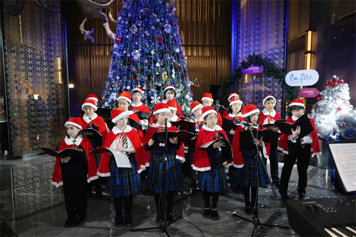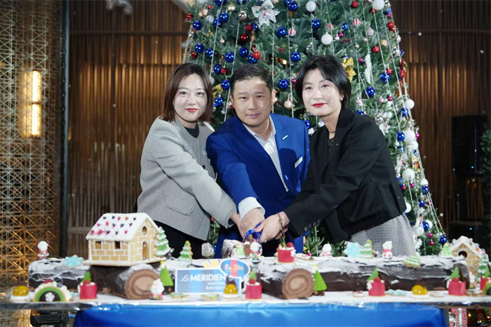 随着夜幕降临,温馨的圣诞点灯仪式在大堂华丽上演。在由南通惠立学校学生组成的唱诗班纯净的歌声中,立翔集团副总裁薛朝阳女士、酒店总经理沈胚明先生及在场嘉宾共同点亮了璀璨的圣诞树,象征着光明、希望与崭新的开始。其后的切树根蛋糕仪式,进一步传递了节日的温暖祝福,现场洋溢着浓厚的节日欢庆氛围。