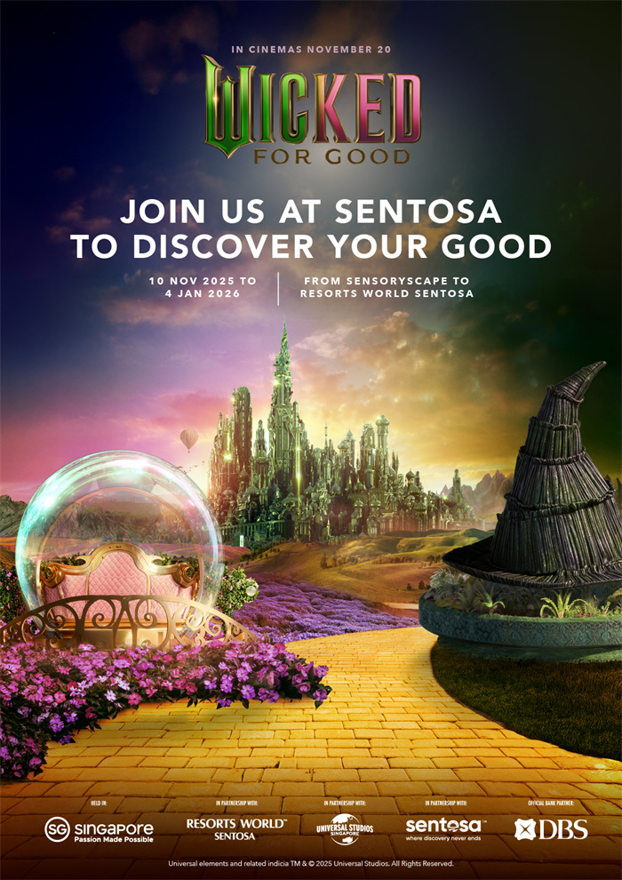 当年底的节日氛围渐渐升温,圣淘沙名胜世界的冬季也在被魔法悄然点亮。2025年11月10日至2026年1月4日期间,灵感源自电影《魔法坏女巫:第二部》的Discover Your Good魔法风暴蔓延,让这座热带海岛化身为“奥兹国”的现实镜像。沿着黄砖路,从圣淘沙心之音出发,一路走进圣淘沙名胜世界内的“翡翠城”。电影中的经典意象化作巨型艺术装置,为游客开启一段光影交错、感动不断的魔法旅程。新加坡环球影城好莱坞主题区更是华丽变身,让荧幕奇迹跃动于现实之间,为影迷缔造超越想象的魔法节日回忆!