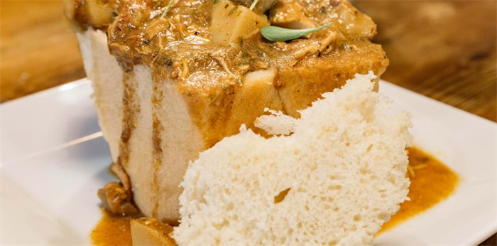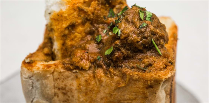 Bunny Chow 的制作工艺虽然粗犷,却蕴含着极实用的生活智慧。标准的 Bunny Chow 选取长条形的白吐司面包,切成半个或四分之一,将中间暄软的面包芯完整挖出,形成一个天然的、厚实的“面包碗”。在这个“碗”中,厨师会盛满热气腾腾、香料浓郁的德班咖喱——通常是焖至软烂的羊肉(Mutton)、鸡肉,或是素食者喜爱的糖豆(Beans)。最关键的一步,是将之前挖出的面包芯盖子盖回顶部。这块面包芯在封存热气的同时,会像海绵一样迅速吸饱最顶层的红油与肉汁,成为整道菜的精华所在。