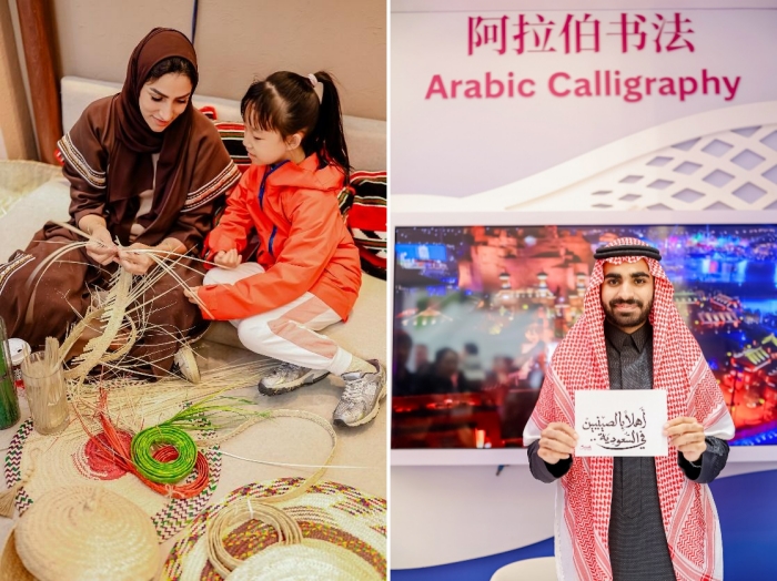 不同于传统展览,“沙特小镇”通过沉浸式场景让沙特文化遗产真正“活”起来。游客可以在德拉伊耶展区了解图拉伊夫古城的三千年历史,在吉达展区欣赏传统陶艺手工艺展示,在埃尔奥拉展区与世界遗产黑格拉“云合影”,还可以亲身体验藤编工艺。在利雅得展区,现场特设的阿拉伯书法工坊备受欢迎,专业书法家可为游客将中文名字书写成阿拉伯书法艺术卡片,成为一份独特的文化纪念。