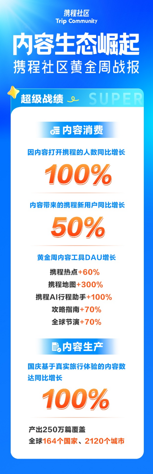 “超级黄金周”正式收官,携程集团发布《旅行内容生产消费双节报告》显示:双节期间因内容打开携程APP的人数同比去年翻番,内容拉新用户增长50%。越来越多用户不再仅仅为了“预订”,而是来携程进行内容消费、内容生产和互动交流。