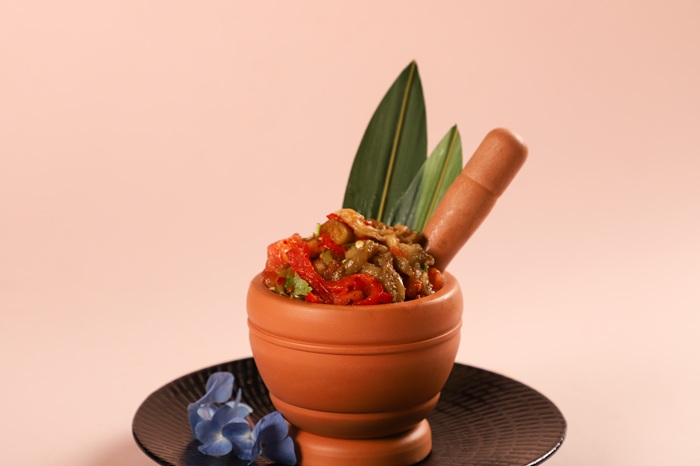 将茄子与辣椒置于明火烤至焦香,去皮后与大蒜、小米辣、柠檬等一同舂捣,使得食材味道充分融合,入口鲜、辣,清爽。