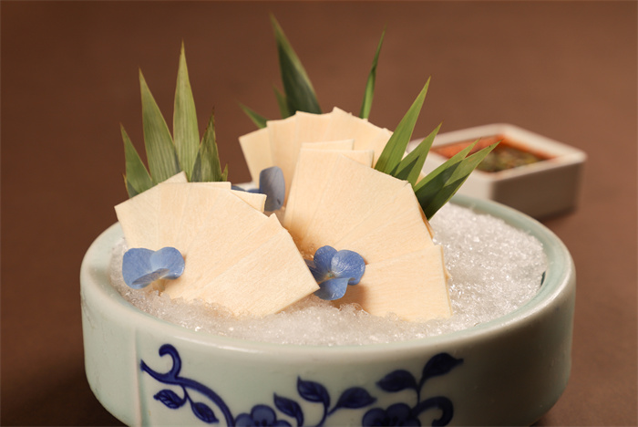来自云南普洱的甜龙笋,因其“高甜度、纤维细腻、可生食”的优良特性,被誉为“蔬中刺身”。借鉴刺身料理工艺,以“冰镇生食”方式品尝,将鲜笋切为薄片,经冰镇静置后食用。入口甘甜鲜明,质地清脆爽口,风味清新自然,充分感受食材本身的新鲜本味与纯粹质感。