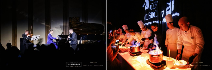 作为全国首站,杭州柏悦酒店为宾客匠心打造一场多重感官之旅。夜幕渐起,悠扬乐声在优雅氛围中流淌,赵胤胤携德国德累斯顿国家乐团首席小提琴家Federico Kasík及首席单簧管演奏家Robert Oberaigner带来经典演绎,于婉转旋律间开启赏味篇章。