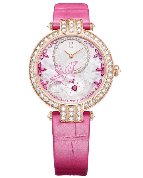 一只可爱的小鸟正在展翅飞翔,完成将爱意及时送达的使命。这只小鸟漂亮洁白,以粉色漆绘勾勒轮廓,喙中衔着情书信封。穿梭于时分刻度之间,争分夺秒,只为确保这份饱含爱意的信件能在情人节当天送达收信人手中。尽管信中内容秘而不宣,但这封白色漆绘信封里满载着深情告白。信封以一颗红色心形红宝石封缄,象征着爱的普世语言。