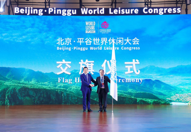 北京•平谷世界休闲大会组委会副主席,平谷区区长吴小杰与世界休闲组织理事马忠强进行交旗仪式